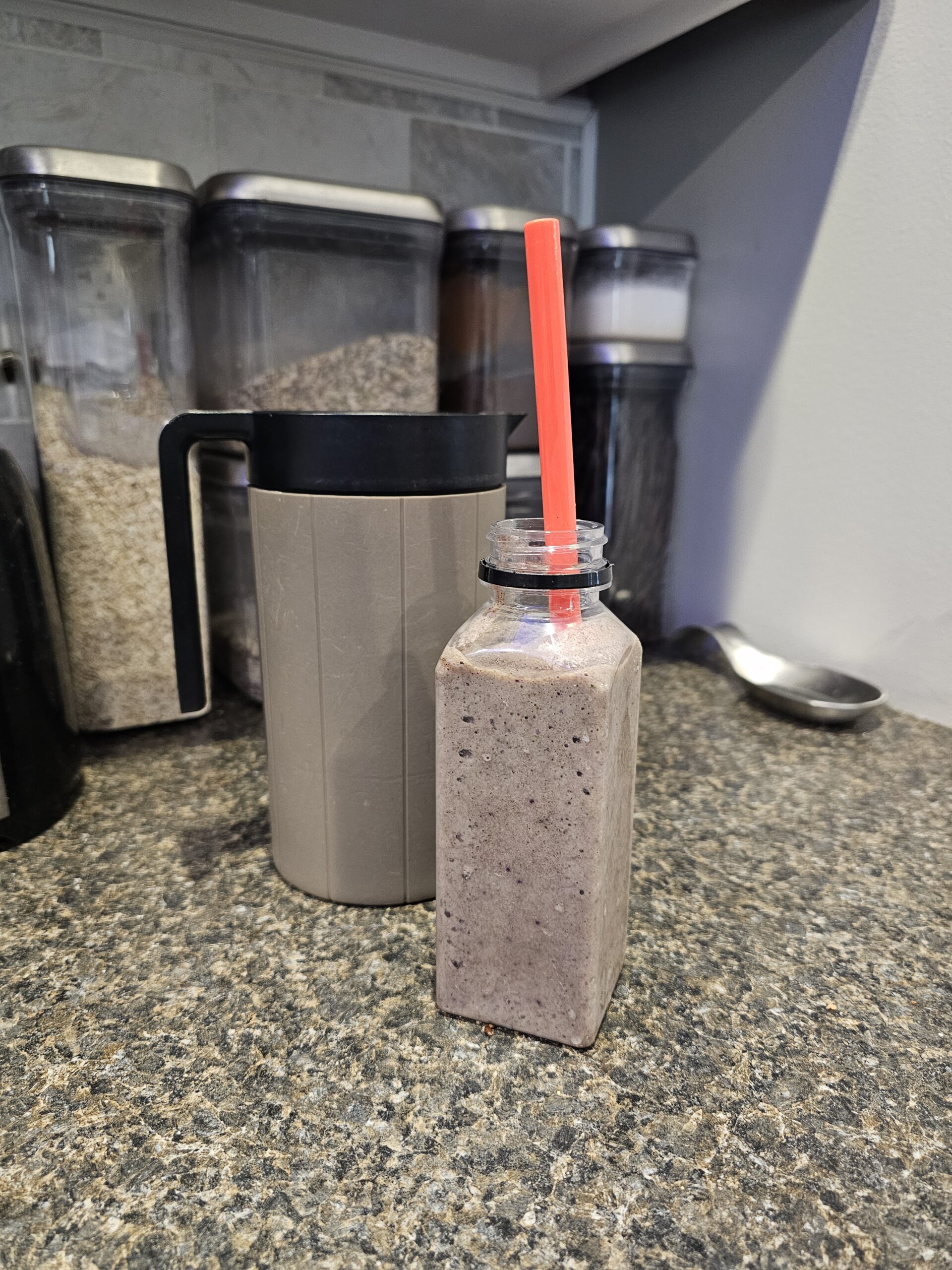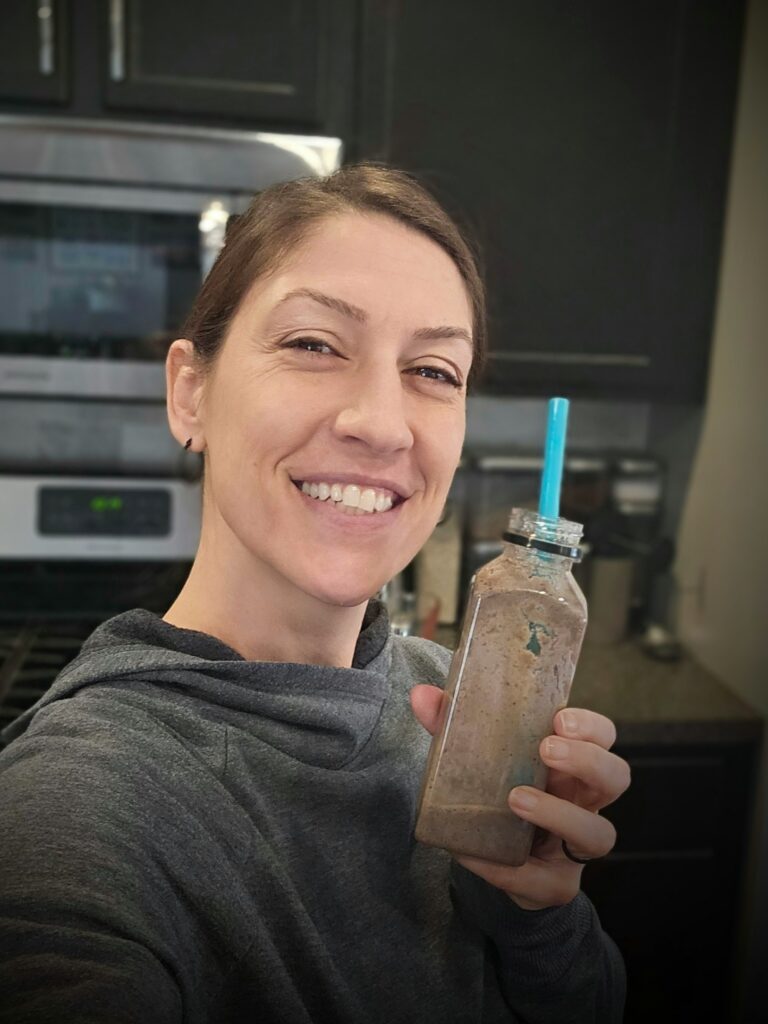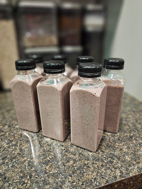 Trainer Tracy here. I’m tired, I’m hungry, and my toddler wants my undivided attention. Time to grab a quick smoothie snack from the fridge! Several of you asked for my go-to smoothie recipe. It’s not fancy, but for me it does the trick. It freezes well and I almost always have the ingredients on hand. The following recipe makes 6-7 smoothies that fit into my smaller 12oz containers (read more about those here).